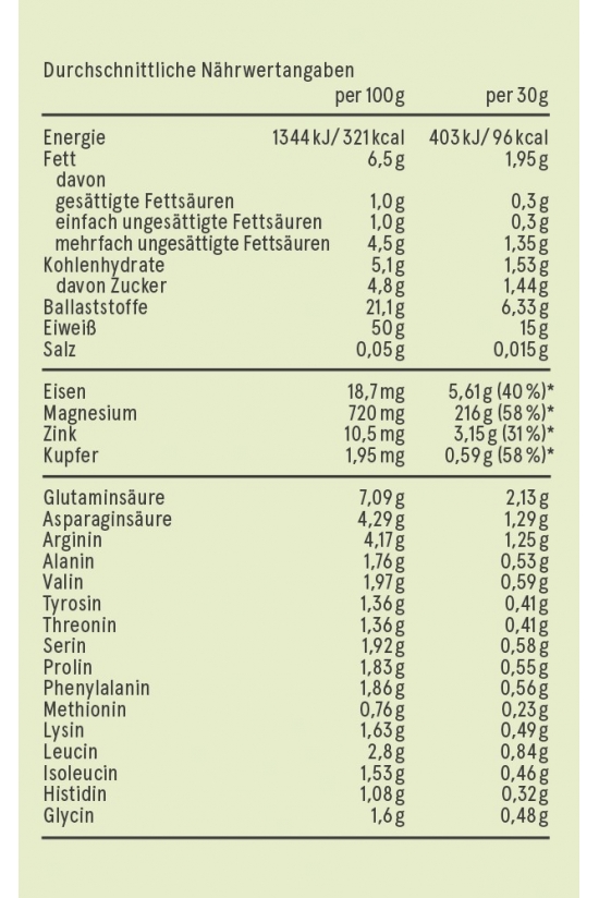 | Inhaltsstoffe | – geprüfte & zertifizierte Qualität – schonend verarbeitet – frei von Zusatzstoffen – hoher Ballaststoffgehalt Zutaten: Gemahlene Bio-Hanfsamen Durchschnittliche Nährwertangaben: Energie: 1344 kj/ 321 kcal Fett: 6,5 g davon gesättigte Fettsäuren: 1,0g einfach ungesättigte Fettsäuren: 1,0g mehrfach ungesättigte Fettsäuren: 4,5g Kohlenhydrate: 5,1g davon Zucker: 4,8g Ballaststoffe: 21,1g Eiweiß: 50,0g Salz: 0,01g |